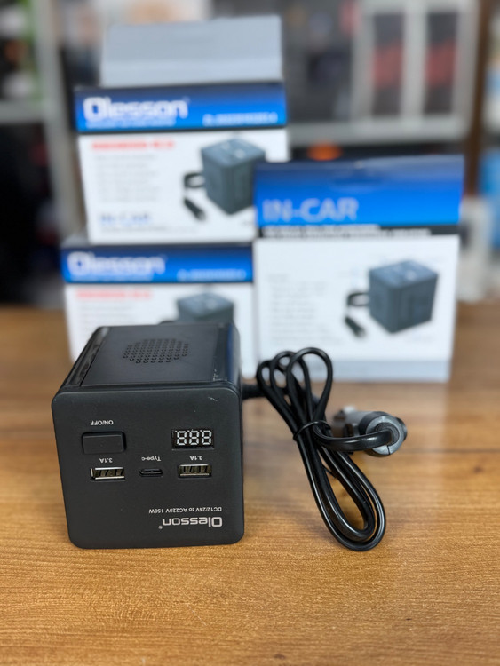 تبدیل برق ماشیندبه ۲۲۰ ۱۵۰وات دو عدد usb و یک عدد تایپ سی ودو عدد دوشاخ خور دکمه قطع کن و نشانگر ولتاژ: تبدیل برق خودرو به 220 و150 ولت